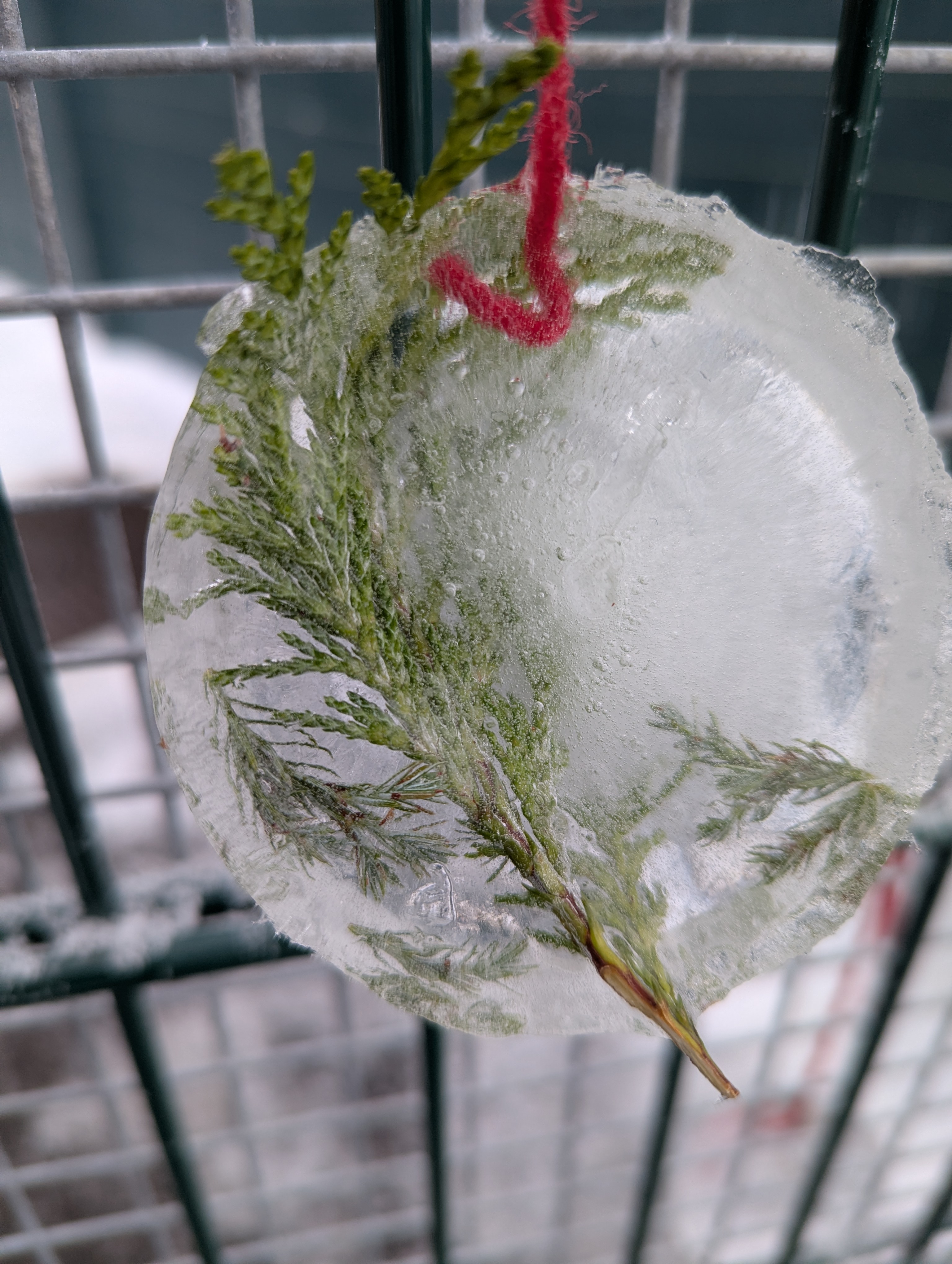 We made collected natural materials and left them in water overnight to freeze. We watched them through the day to see if it got warm enough for them to melt. It didn’t! We all made predictions as to whether they would last all weekend or not.